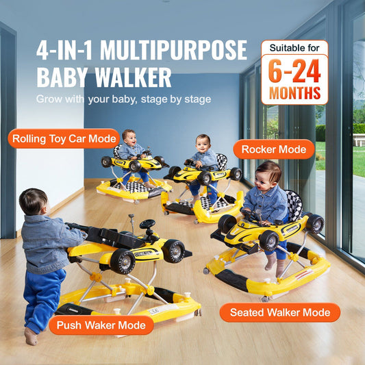 4-in-1 Baby Walker, Foldable Baby Activity Center on Wheels, Adjustable Height, Light, Steering Wheel, Toy Car | Learning-Seated | Walk-Behind | Rocker Toddler Walker for 6-24 Month Boys Girls